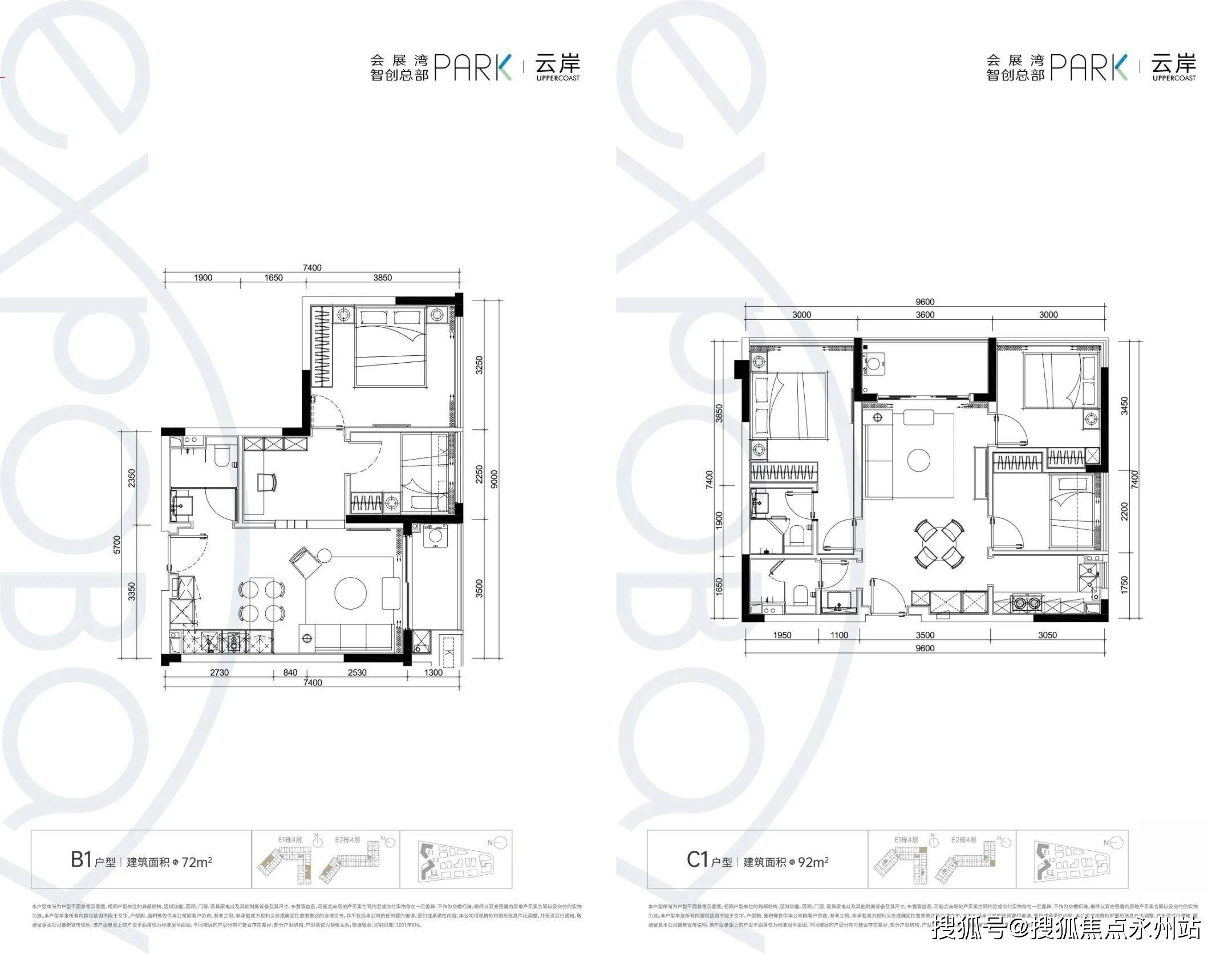 C1户型(92㎡)三房两厅两卫,正南朝向,端头位设计,双面采光,主客分区明确,部分户型可瞰河景。